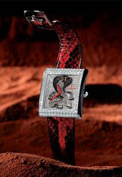 Das Gehäuse aus Weißgold ist quadratisch. Aggressiv, ist diese Uhr so weit wie der Realismus der Cobra-Design in einer Graduierung von verschiedenen Edelsteinen der Farbe, mit gelben Augen und Mund weit offen, aufrecht ausgebildet ©, bereit zum Angriff. Die Designer schoben den Schraubstock hoch, um diese Uhr auf einem echten, rot und schwarz getönten Armband aus Pythonleder anzubringen. Diese Reptilien-Uhr wird aufgrund ihres avantgardistischen Stils sowohl dem männlichen als auch dem weiblichen Handgelenk gerecht.